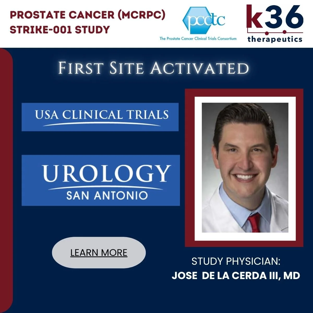We’re excited to announce the activation of San Antonio, Texas’ USA Clinical Trials as the first site for the PCCTC-managed phase 1 clinical study of K36’s novel NSD2 inhibitor KTX-2001 (STRIKE-001; NCT07103018). STRIKE-001 is the first-in-human clinical trial testing KTX-2001 alone and with darolutamide in participants with metastatic castration-resistant prostate cancer (mCRPC). The study aims to assess the safety, pharmacokinetics (PK), pharmacodynamics (PD), and preliminary efficacy of KTX-2001 monotherapy and KTX-2001 in combination with darolutamide (NUBEQA), and to establish a recommended Phase 2 dose(s) (RP2D) of KTX-2001 for future study.